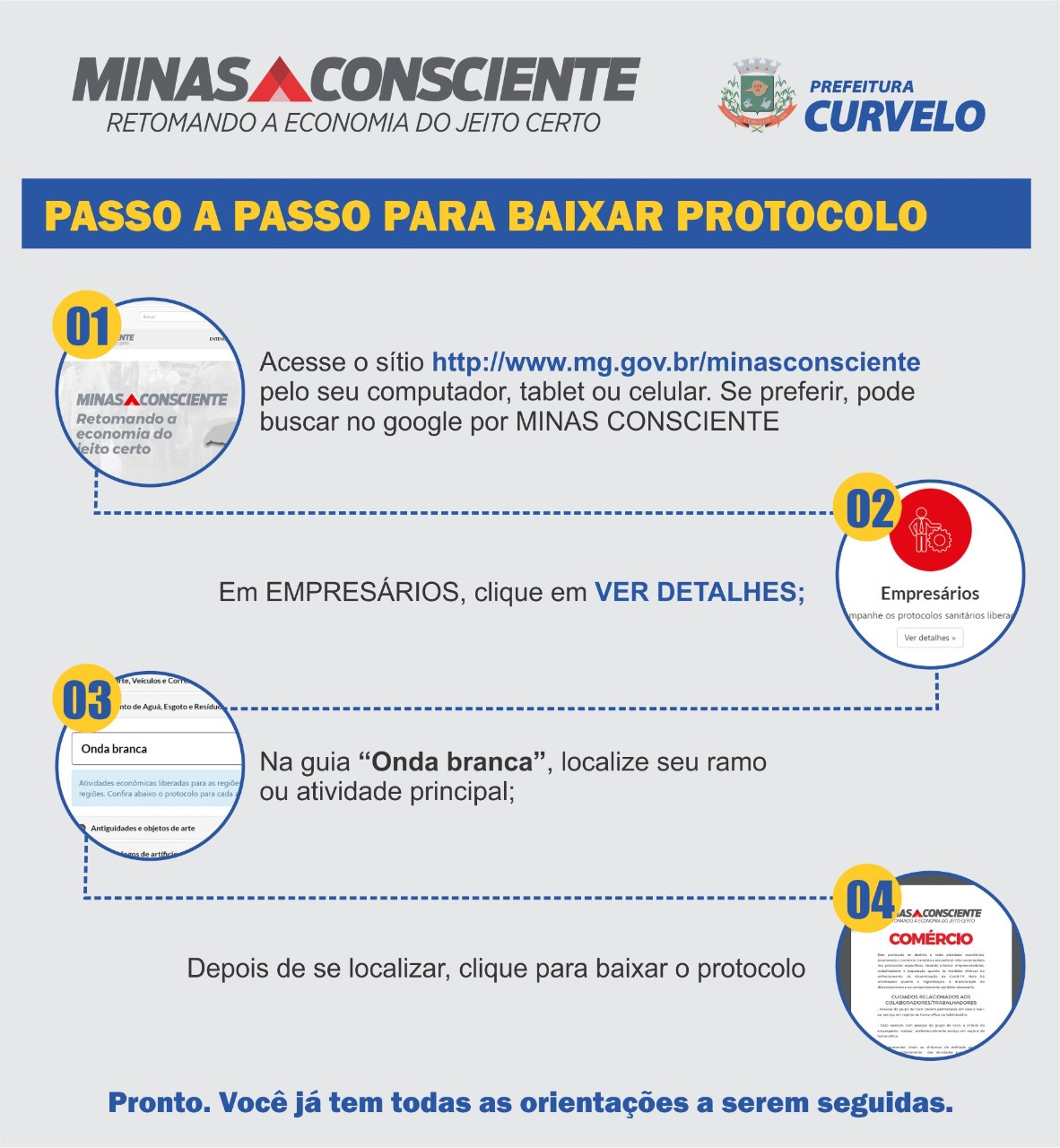 O comitê de crise de Curvelo/MG decidiu andar em consonância com o programa “Minas Consciente – Retomando a economia do jeito certo” que pretende orientar a retomada segura das atividades econômicas nos municípios do estado.