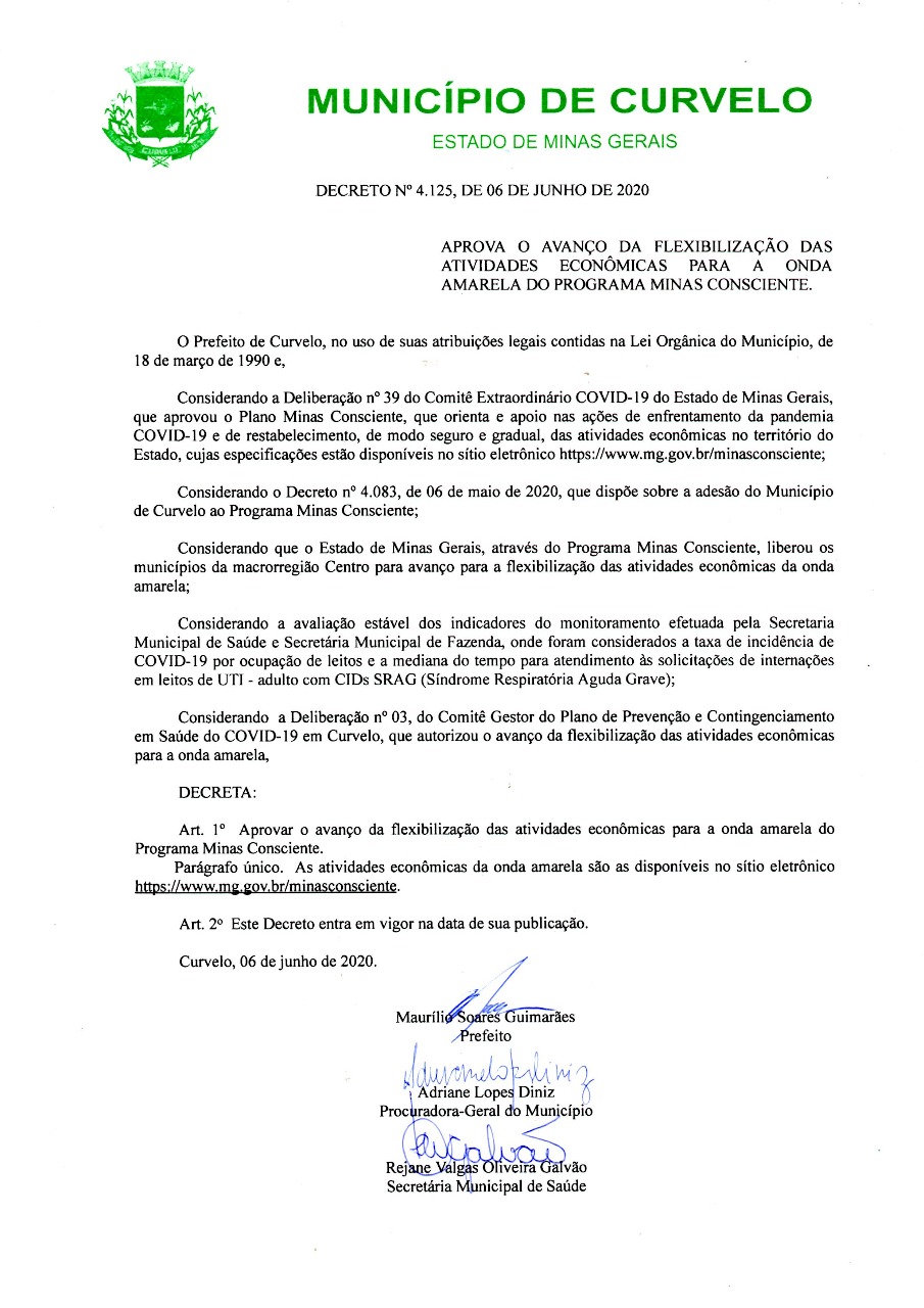 No fim da tarde de sexta-feira, dia 05 de junho de 2020, após aprovação quase unânime pelo Comitê Gestor Covid-19, ficou decido a liberação da “ONDA AMARELA” do Programa Minas Consciente, do Governo do Estado de Minas Gerais que está na sua VERSÃO 14 que prevê a reabertura da economia de forma gradual e segura, com normas rígidas próprias a serem observadas e várias restrições. O prefeito Maurílio Guimarães assinou no dia (06/05/2020) o DECRETO 4.125 que aprova o avanço da flexibilização das atividades econômicas para esta onda.