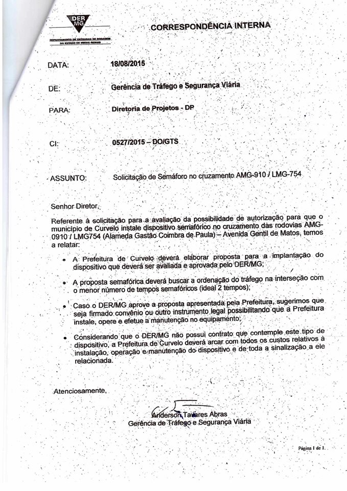 Oficio DER para PrefeituraNo ofício, o Departamento Estadual de Estradas de Rodagem diz claramente que “a Prefeitura de Curvelo deverá arcar com todos os custos relativos à instalação, operação e manutenção do dispositivo e de toda a sinalização a ele relacionada”.  O projeto solicitado foi enviado pela Prefeitura ao DER em setembro de 2015, mas a autorização do Estado só veio no dia 14  de dezembro de 2015, três meses depois, quando então, começaram os preparativos para licitação do equipamento e execução da obra, bem como do citado convênio.
