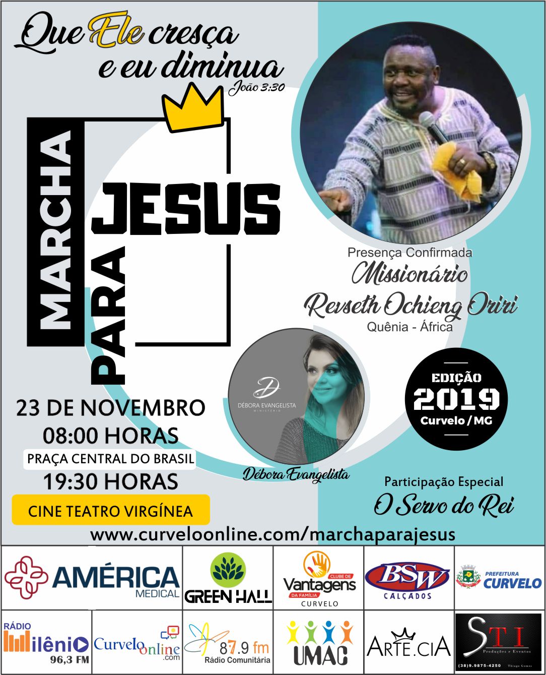 A segunda etapa acontecerá no CINE TEATRO VIRGÍNEA a partir das 19:00h com participação da cantora Débora Evangelista, O servo do Rei e demais convidados.
