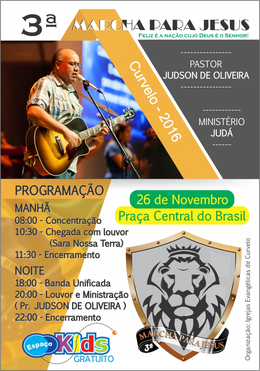 As igrejas evangélicas de Curvelo se reúnem para promover a 2ª Marcha para Jesus. Em 2014 a Marcha foi sucesso e agora em 2015 a organização preparou algo especial com participações de artistas do meio gospel, dança, teatro, palavra de Deus e muito mais.