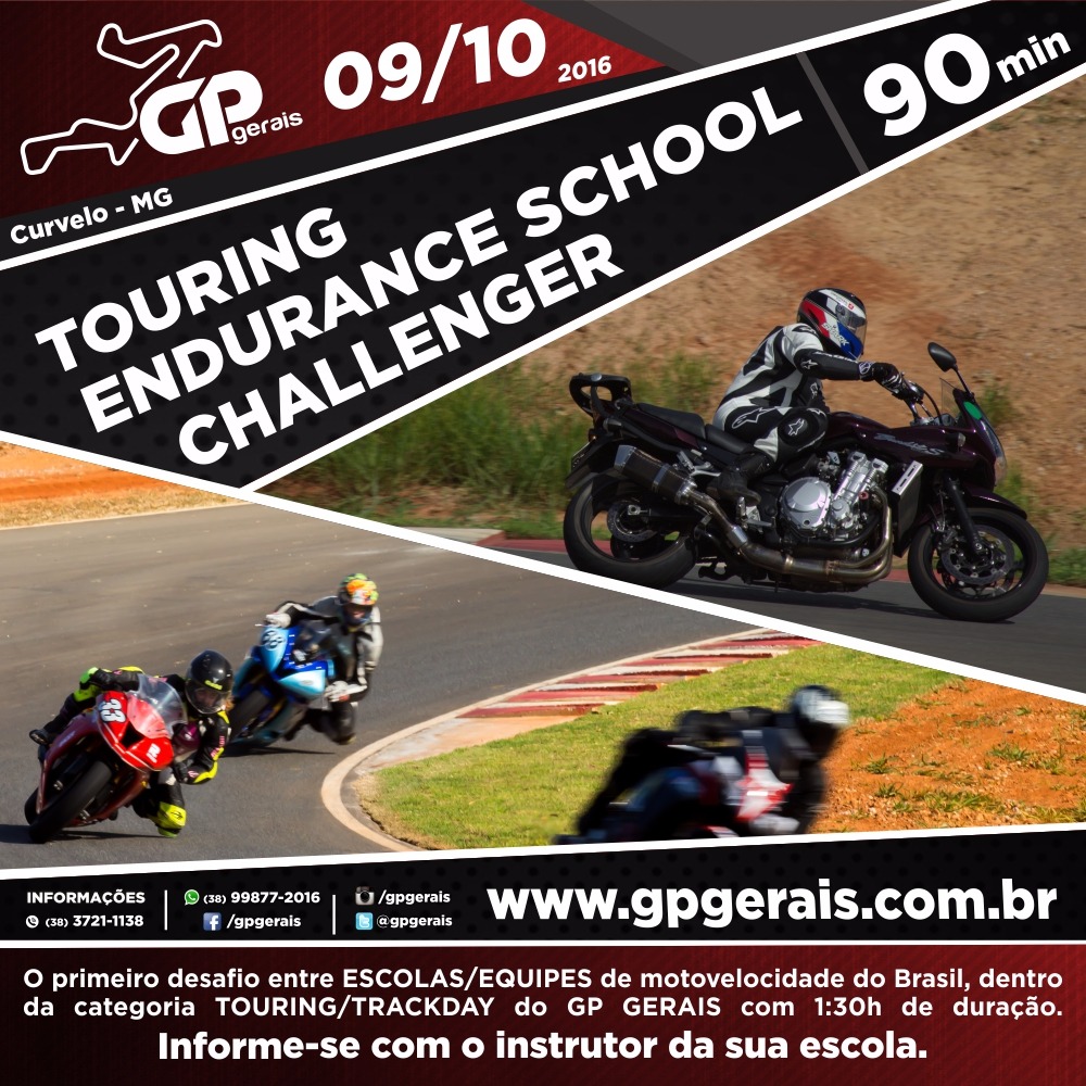 Com isso, o GP Gerais será também palco do “Touring Endurance School Challenge”, misto de aprendizado e competição que vai proporcionar um desafio inédito: instrutores de todo o país reconhecidos pela organização formarão times com seis motociclistas cada, sendo dois com máquinas esportivas, dois com motos naked e dois com big trails – todos devem estar inscritos na classe Touring e participar ao menos de uma das sessões de treinos, com preços promocionais a partir de R$ 300. No domingo, as seis motos entram na pista em esquema de revezamento, para a animada disputa com o cronômetro (e os adversários) por 90 minutos, que premiará os melhores times. A expectativa é da participação de pelo menos 10 sextetos, número que, pelo interesse inicial demonstrado, deve ser bem maior.